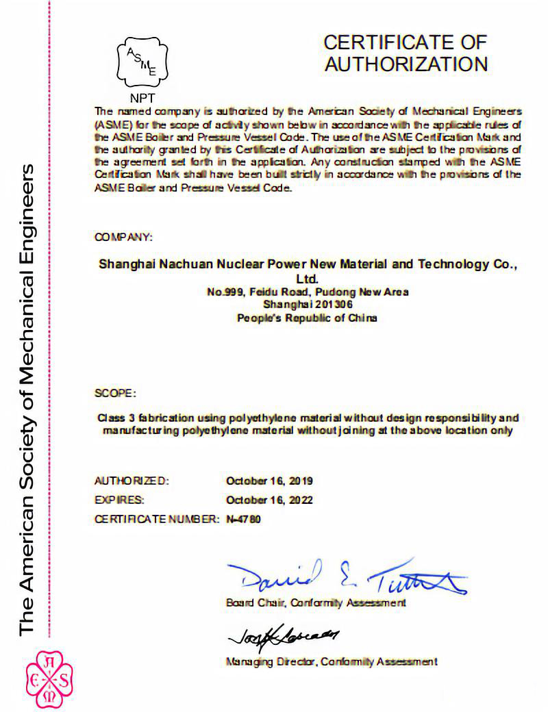 自2018年6月开始,上海星空xk官网平台在ABS公司的指导下开始了此项认证的申请工作,公司取证小组历时一年半时间,先后在ASME核3级HDPE部件焊接工艺及人员资格评定、管件或焊缝无损检测工艺及人员资格评定、国外核级原料厂家评审质保要求、ASME核3级产品检验试验大纲等方面取得了突破,于2019年6月20日以无遗留整改项的成绩通过了由3位美国ASME协会核电专家及2位ABS公司审核员组成的联检组的现场审核;