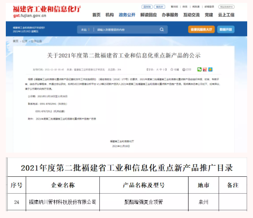 日前,福建省工业和信息化厅发布了《关于2021年度第二批福建省工业和信息化重点新产品的公示》,星空xk官网平台股份“聚酯增强复合顶管”列入2021年度福建省工业和信息化重点新产品推广目录。