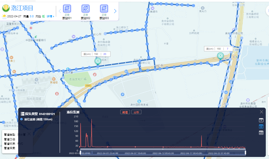 通过智慧水务平台对全域排水管网运行状态进行实时监测,一张网掌控所有运行数据,一张图显示所有设备的运行状况,全面提高排水管线安全运行及风险防控能力,同时有效解决日常管网运维各种问题,促进排水管网安全运行。